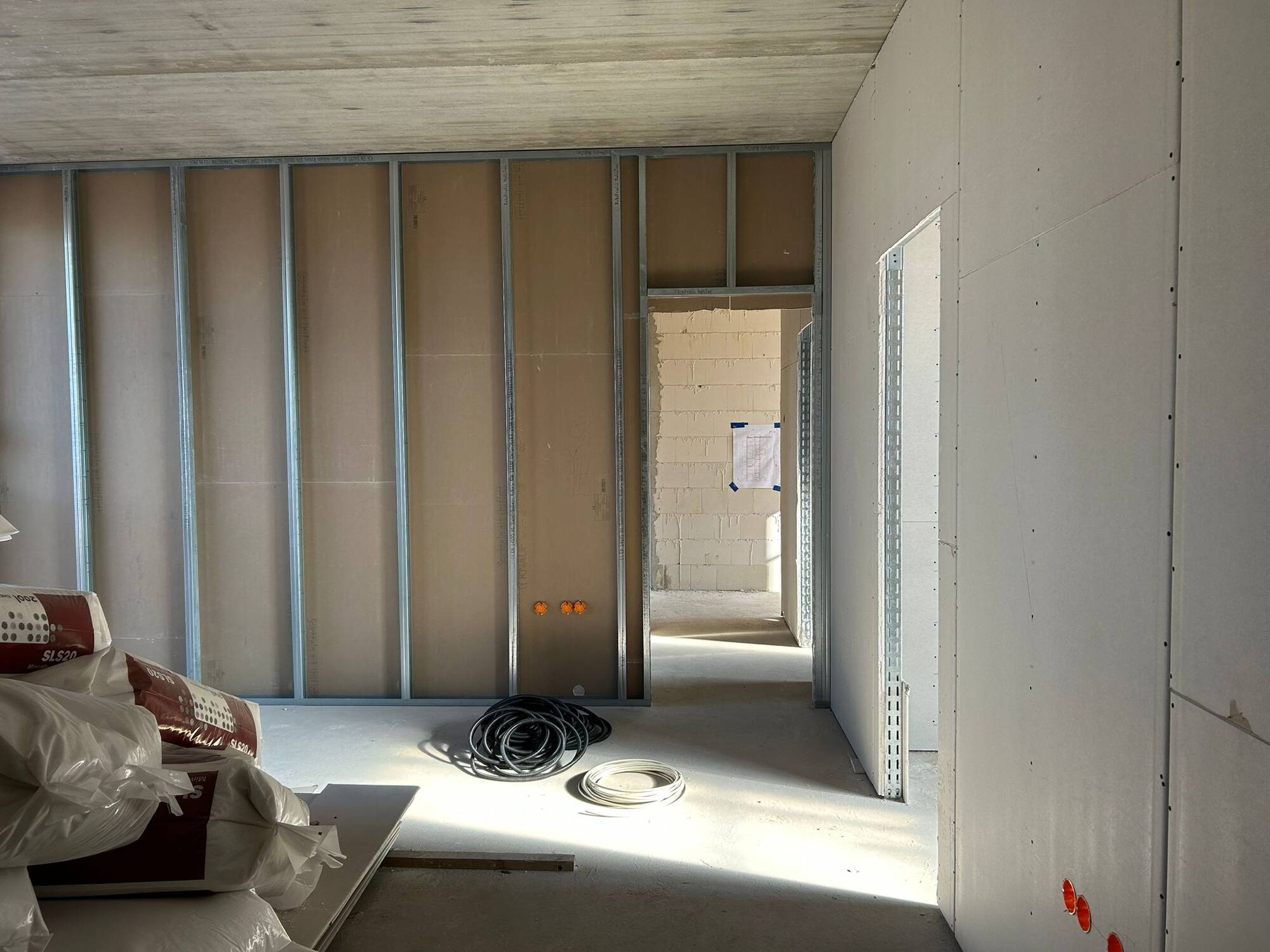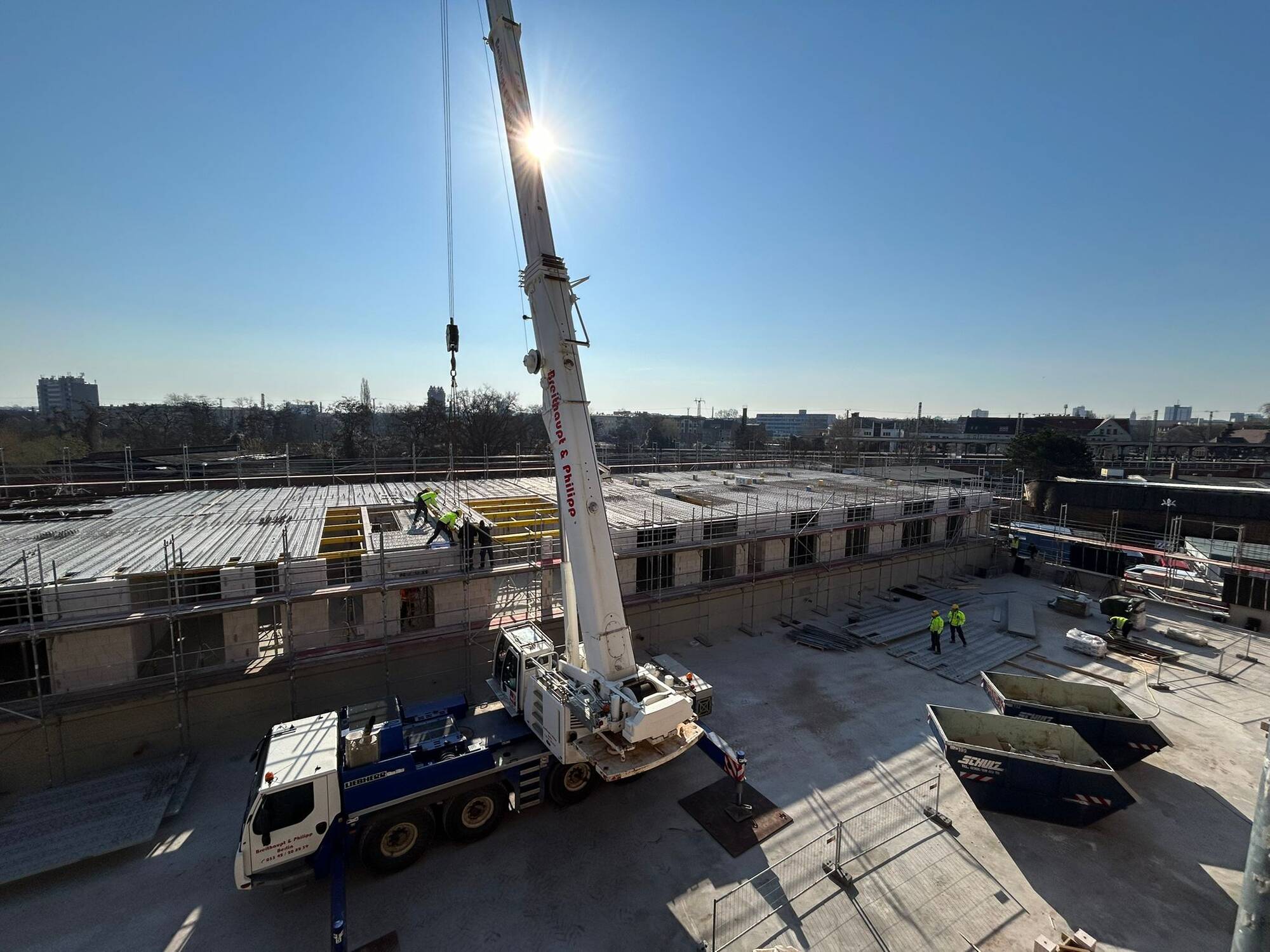 Im Gebäudeteil A sind die Rohbauarbeiten fertig gestellt. Der Innenausbau schreitet weiter voran; derzeit befinden sich der Trockenbau sowie die Rohinstallationen für Heizung und Sanitär in Ausführung. Im Gebäudeteil B wurde die Decke zwischen Erdgeschoss und 1. Obergeschoss fertiggestellt, sodass auch hier der Rohbau in Kürze fertiggestellt wird.